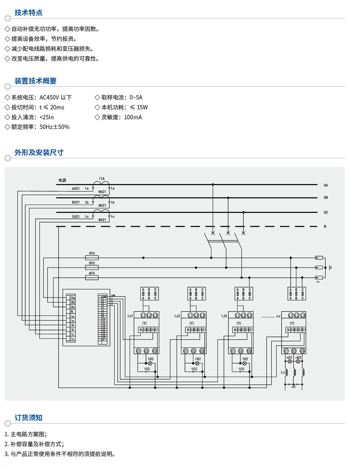 由于本装置能有效改善用电负荷的功率因数,降低线损,提高变压器的实际负载能力。具有显著的节能效果,同时在系统中采用特定的电抗器,还可以有效防止谐波放大、有效吸收大部分谐波电流,使谐电压总畸率限值及各次谐波电流含量限值符合国家标准,达到谐波治理的目的。而如果使用普通的接触器投切电容器组,带来的将会是大的浪涌电流,慢的补偿时间、高的维护费用和短的使用寿命,因此,我们建议用户在以下场合,能优先考虑使用动态无功补偿装置。如:工矿企业的变电所、生产车间及民用建筑等的低压电网中,特别适合负荷经常变化,无功功率不稳定的输配电系统。本产品符合:GB/T15576-2008《低压成套无功功率补偿设备》、IEC60439《低压成套开关设备和控制设备》等标准。